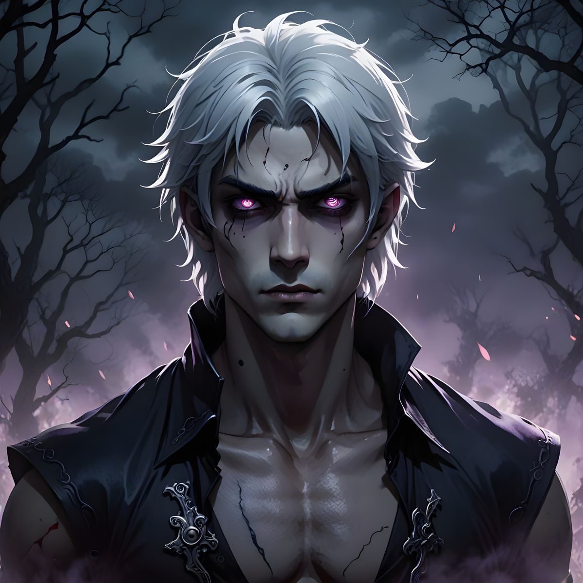 This image shows a shirtless, young, white-haired vampire enshrouded in mist against a black backdrop. The artwork features cel-shaded, deep colors in a manga scan style.
