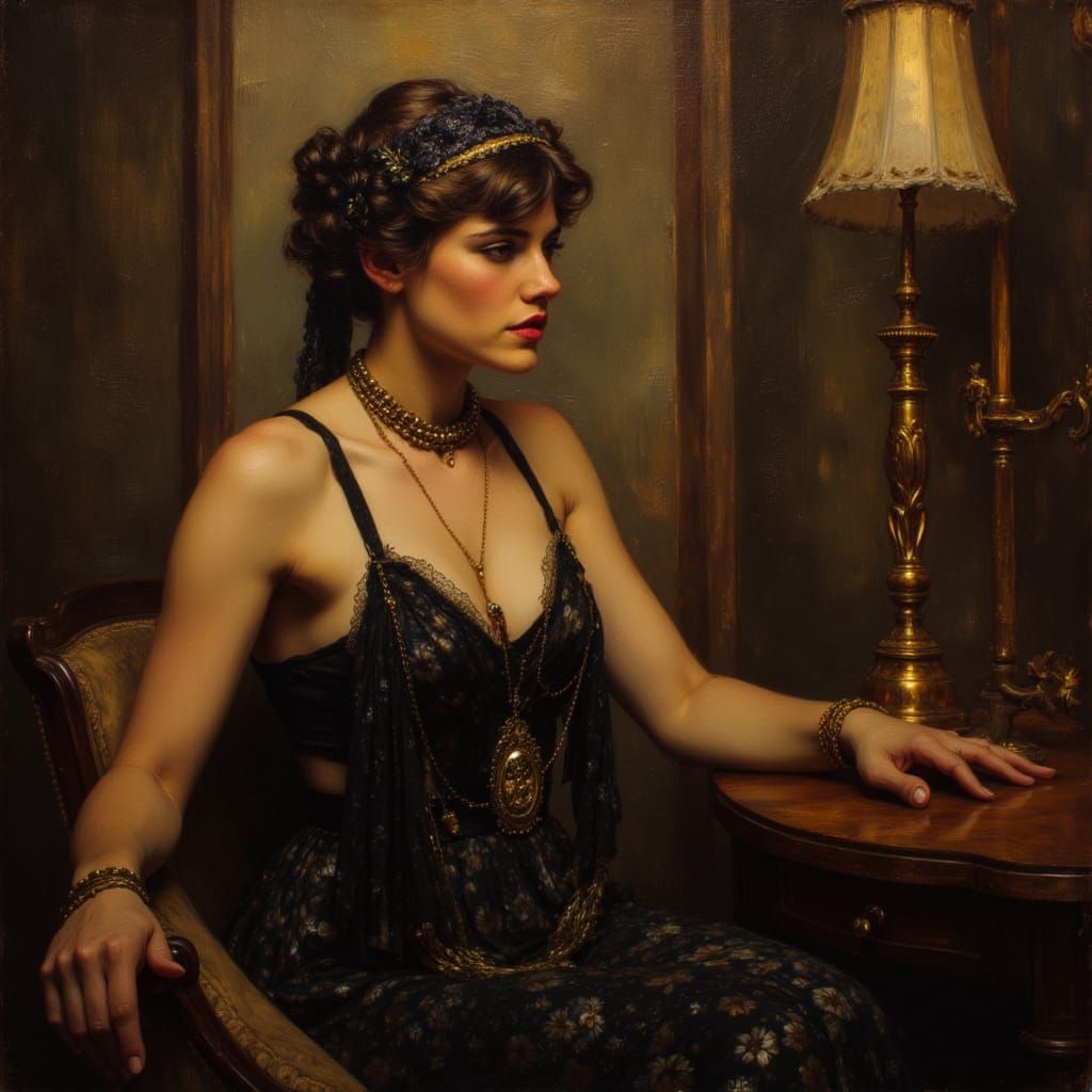 A striking picture of a 1920s flapper in a parlour. The image showcases an Art Deco style with black and gold accents, rendered as a brushed oils painting.