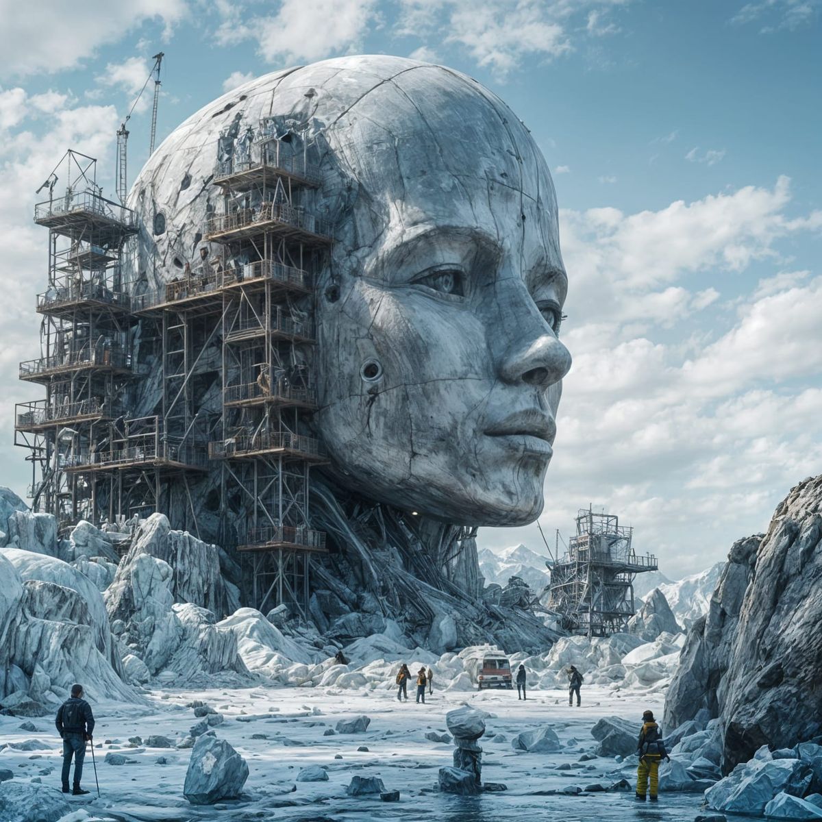 This image shows a solarpunk-inspired, futuristic Mount Rushmore under construction. Eerie rotting ice distorts the structure, contrasting with the clean lines and solar panels. Miniature people are working on the giant idol.
