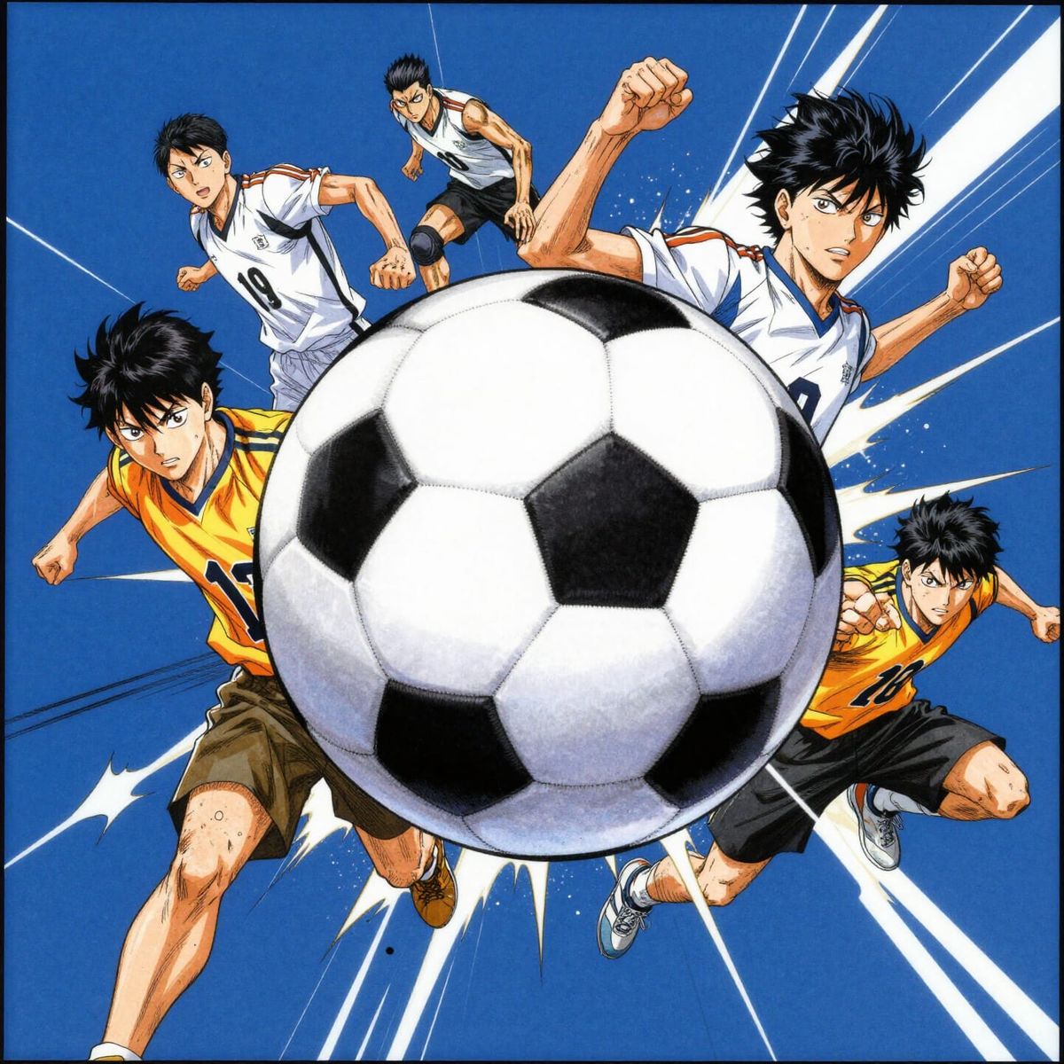 This image captures a vibrant soccer theme, featuring a central ball with energetic figures. The art style is bold and dynamic, inspired by action anime and manga, with striking blue, white, and yellow colors.
