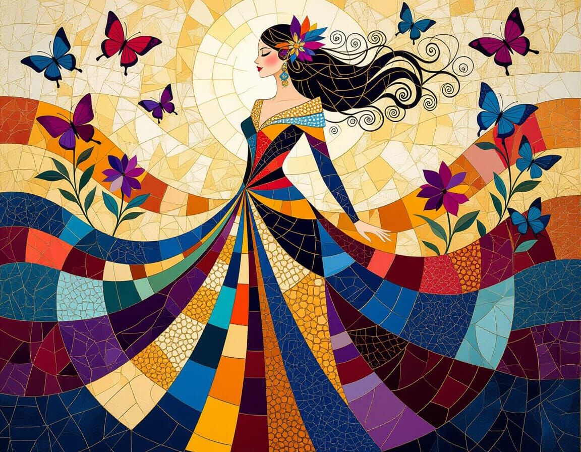 A digital painting of a woman in a fantasy costume surrounded by butterflies and flowers. The artwork features abstractionist geometric shapes and a rich color palette of gold, blue, and terracotta.