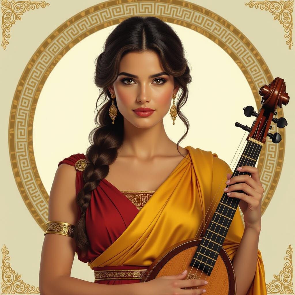 This image shows Arche, the Greek Goddess of Origins, as a beautiful woman with long golden-brown hair and a ruby peplos. She holds a lyre in this hyperrealistic digital painting.
