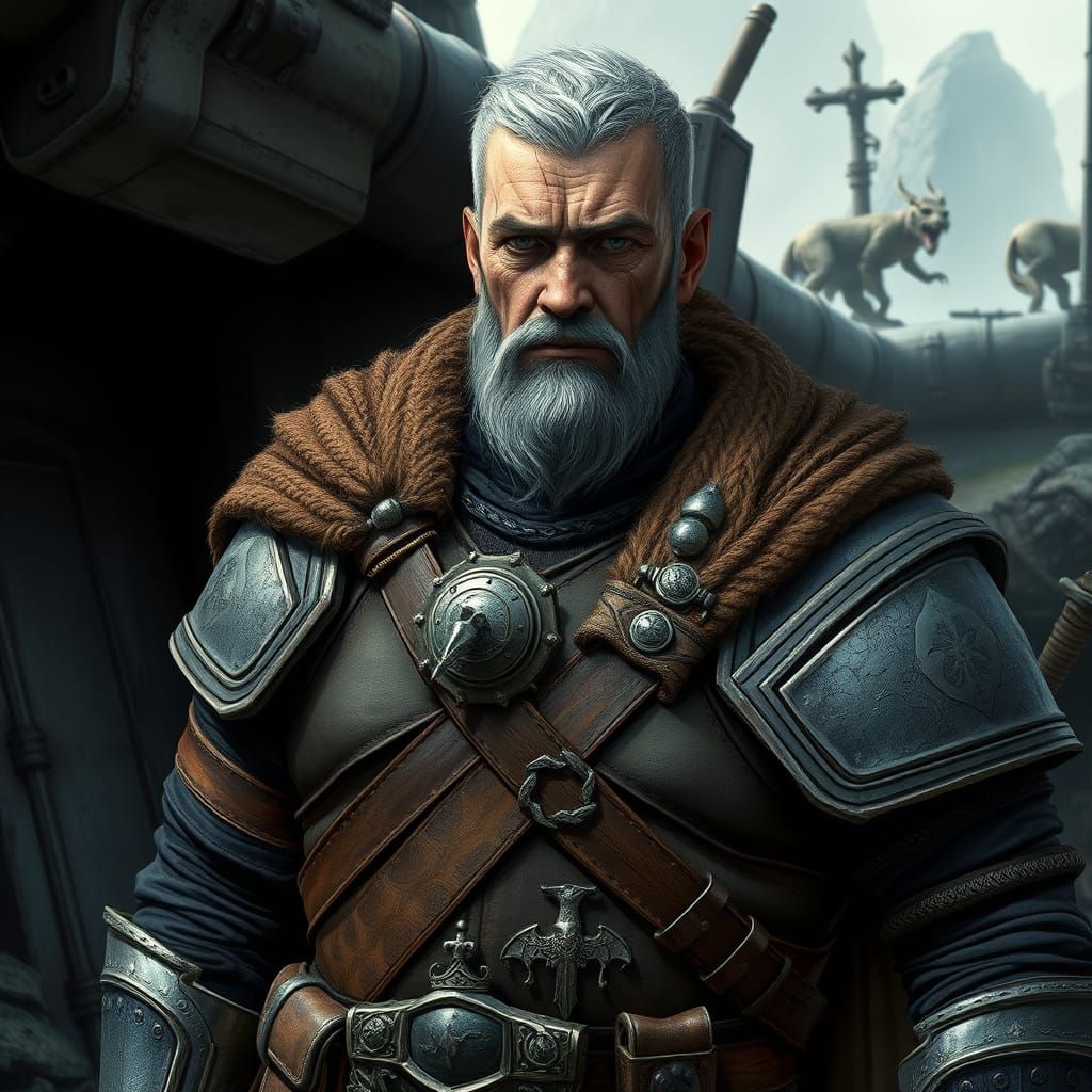 A portrait of a 47-year-old Imperial leader, Dravus Carius, standing strong in his Tel Mithryn residence amidst the harsh, surreal landscape of Solstheim, with scars and traditional armor reflecting his battles and leadership.