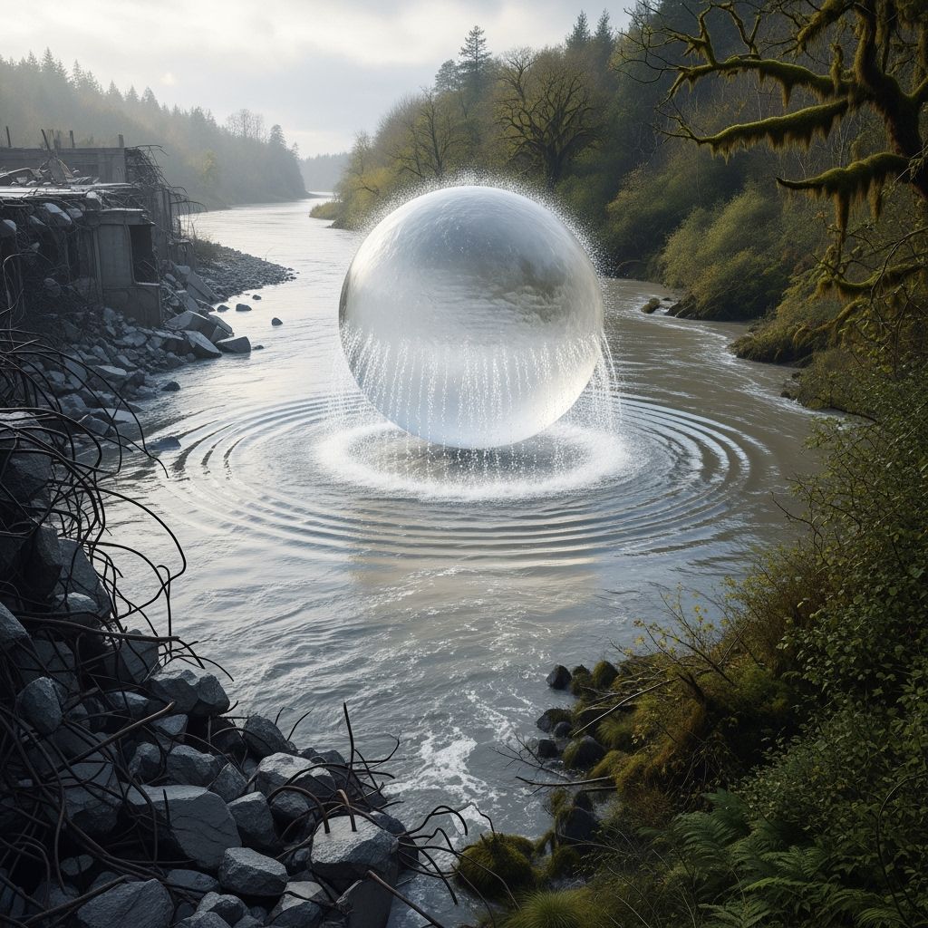 A hyperrealistic image of a giant air bubble hovering in the center of a murky river. Water droplets fly around it as it radiates waves, with destroyed riverbank and lush vegetation.