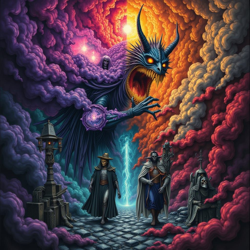 This image depicts a chaotic world where light and darkness collide, creating a visually stunning contrast. The detailed artwork blends elements of brutalism and dark arts.