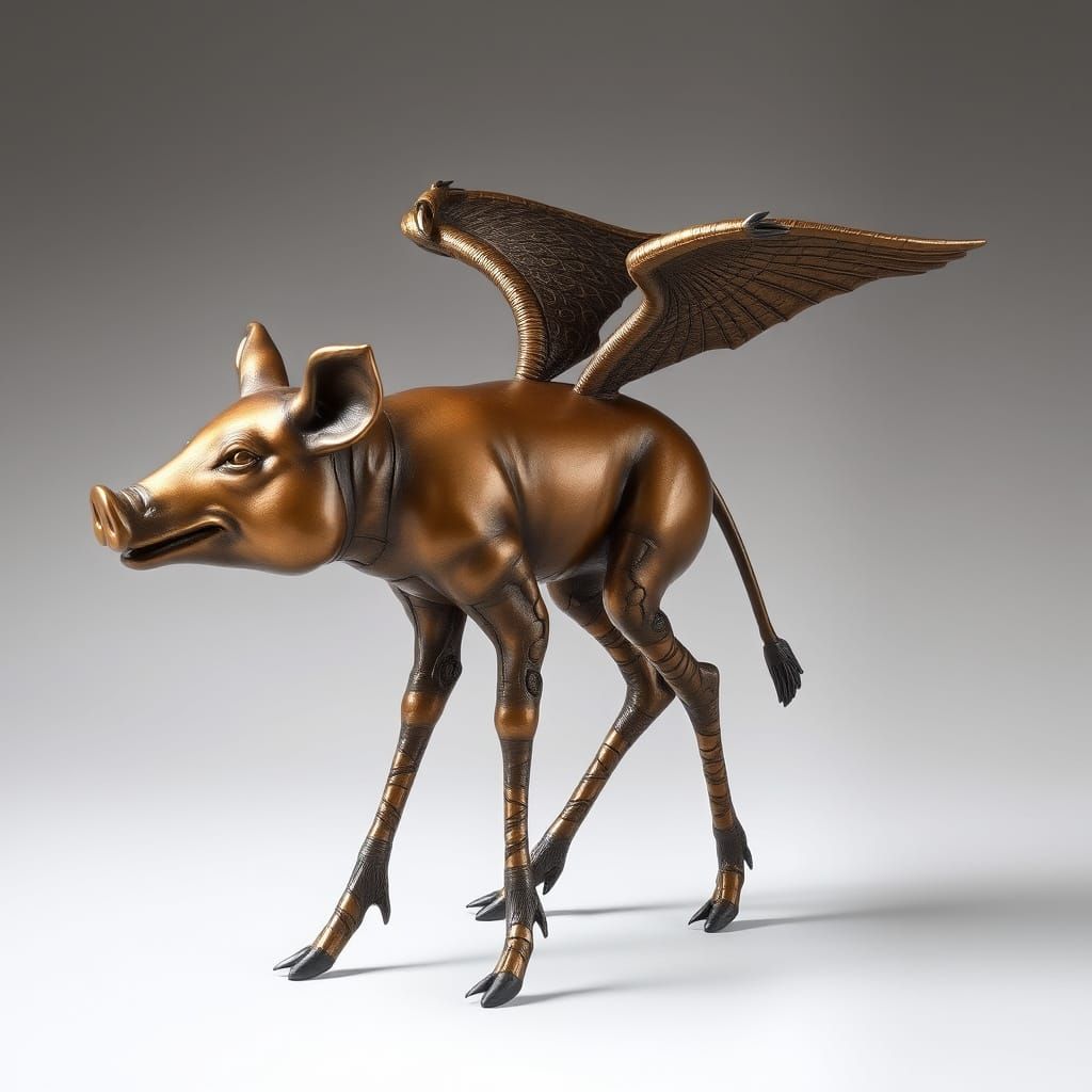 This striking bronze sculpture features a pig body with giraffe legs and flamingo wings, blending organic forms with detailed realism, evoking a dreamlike, mythological atmosphere with warm golden tones and subtle shading.