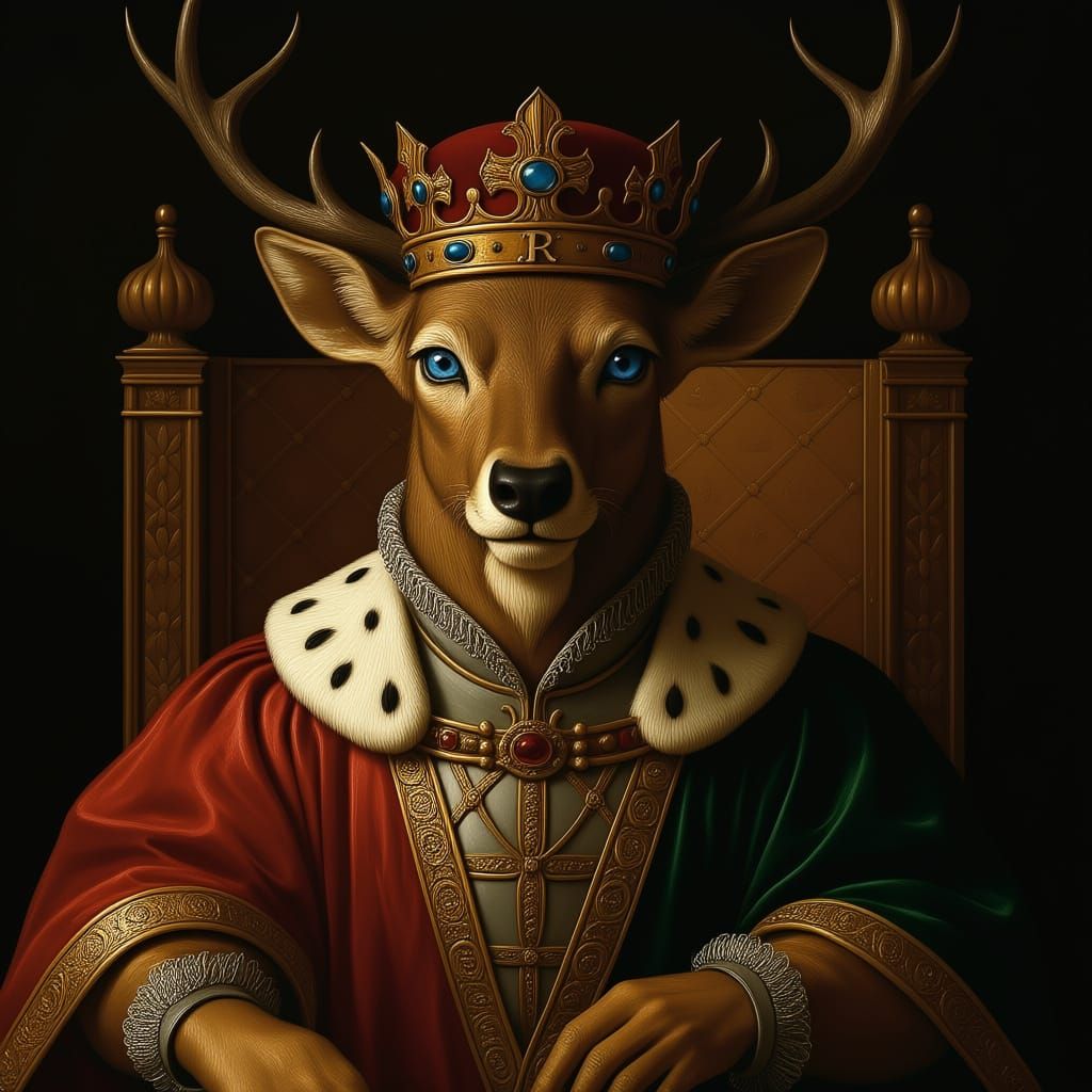 This image shows a regal medieval stag with large antlers, wearing a crown and royal robes. The artwork is rendered in a vintage oil painting style, evoking a sense of historical grandeur.