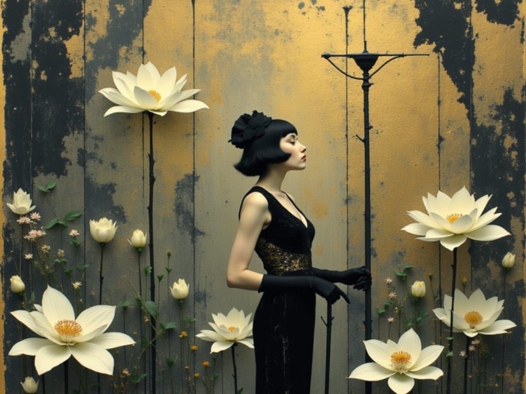 This image shows a nightclub singer in 1940s Art Deco style, with gold accents and black gloves, against a textured backdrop of tropical foliage. The artwork blends elements of digital matte painting.
