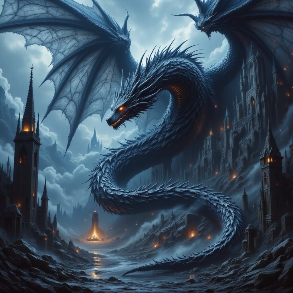 This hyperrealistic oil painting depicts a massive, ancient dragon with obsidian scales wrapped around a gothic cathedral. Deep shadows and a dark color palette evoke a sense of forgotten power.