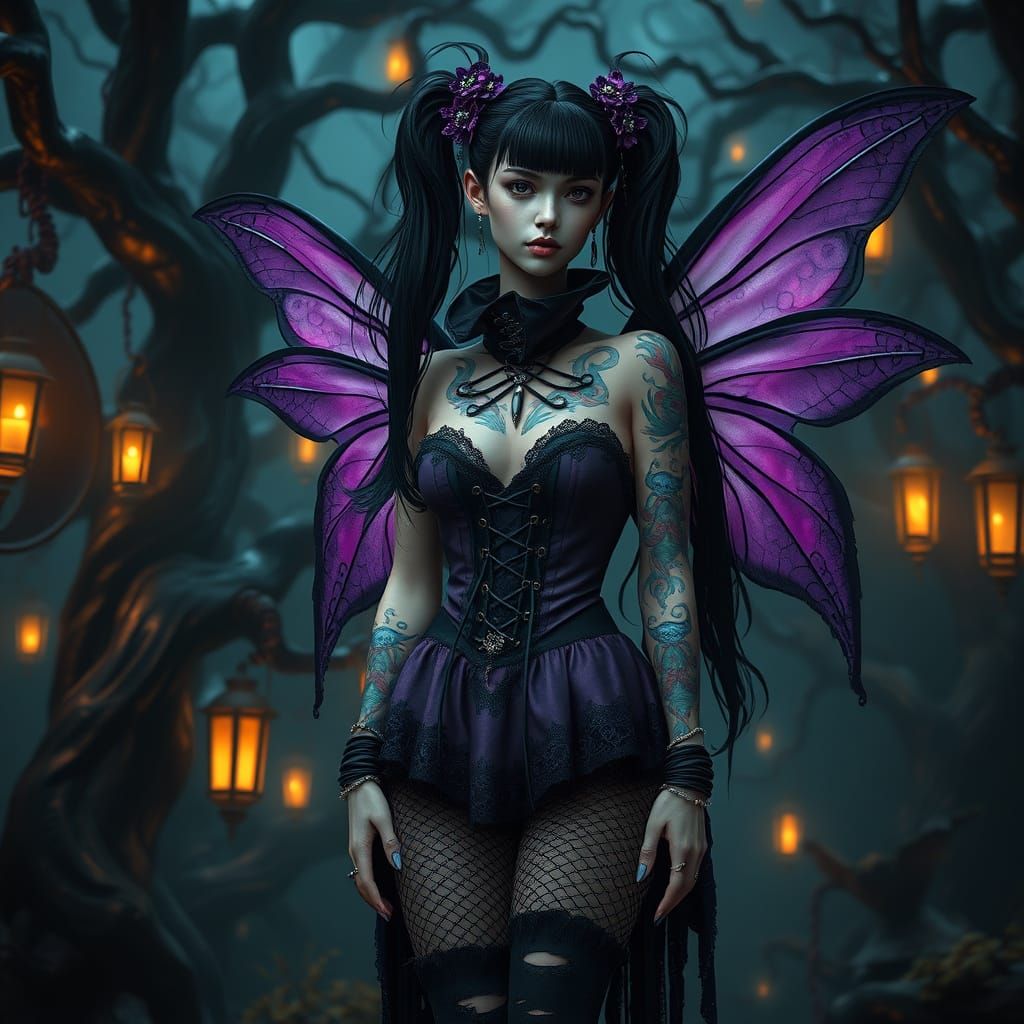 This enchanting image depicts a mystical, gothic fairy with flowing black pigtails and vibrant tattoos, set against a rich, atmospheric backdrop of twisted trees and flickering lanterns, showcasing intricate details and textures reminiscent of modern video game art.