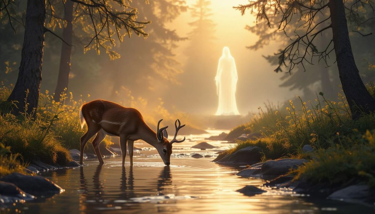 A graceful deer drinks from a clear stream at dawn, with ethereal divine light filtering through trees. Photorealistic style captures deep reverence and nature's beauty.