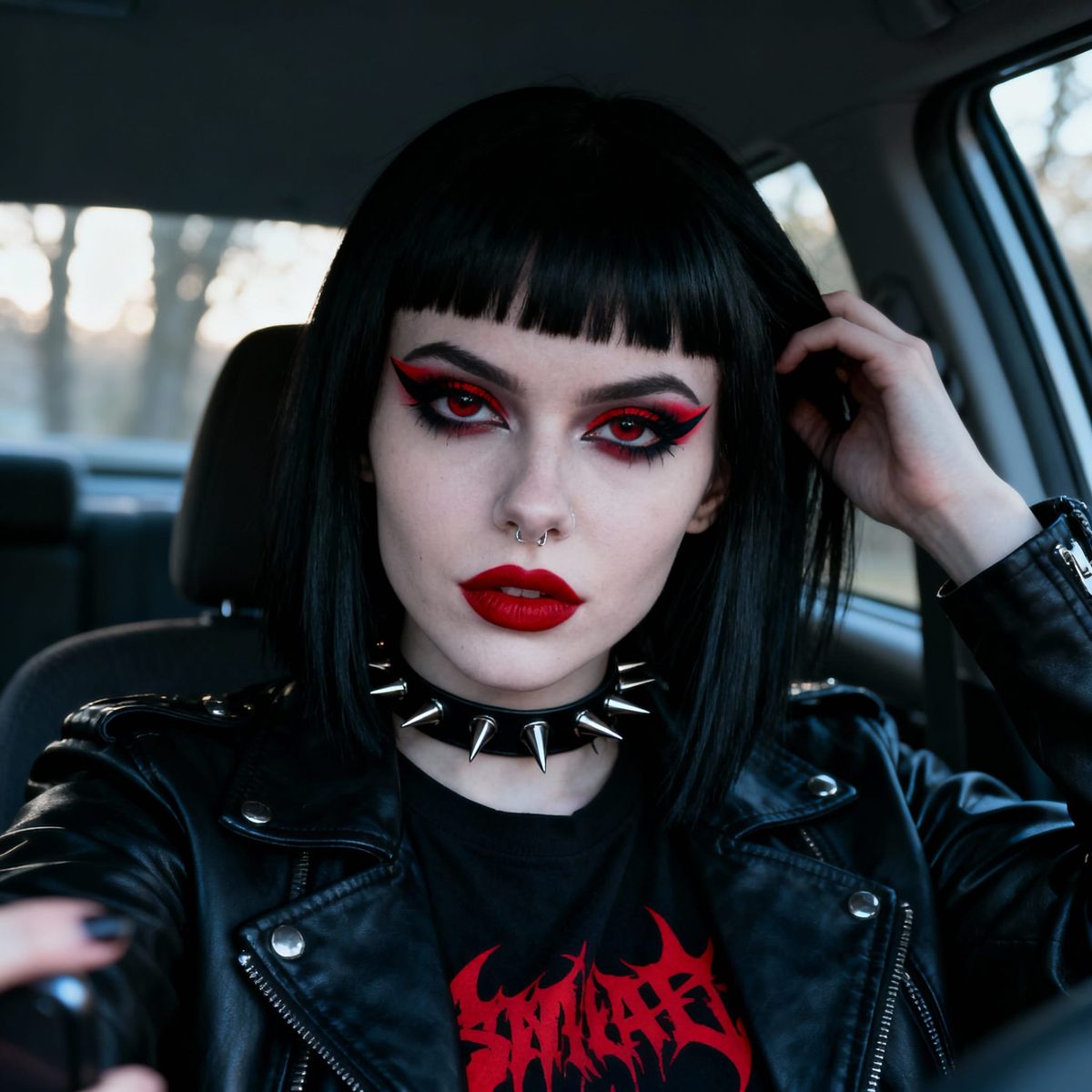 A detailed portrait of a gothic woman with striking makeup and attire, capturing a selfie inside a dimly lit car. Photorealistic style with cinematic lighting.