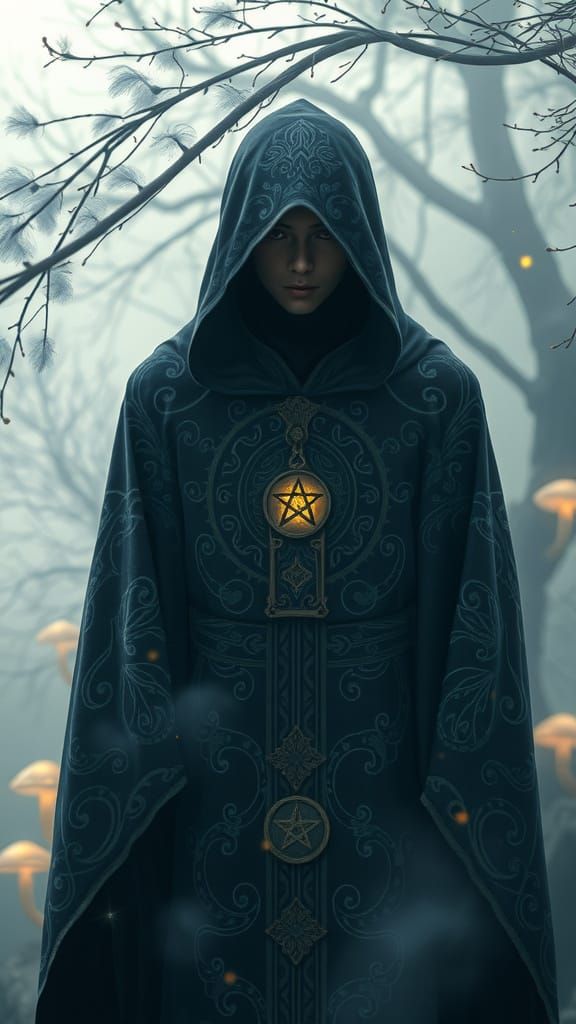 This image shows a mystical, hooded figure in a detailed, twilight-hued robe with intricate patterns and symbols, set against a dreamlike backdrop of misty trees and glowing mushrooms, rendered in a highly detailed, matte painting style with deep colors and subtle textures, evoking a fantastical, high-fa...
