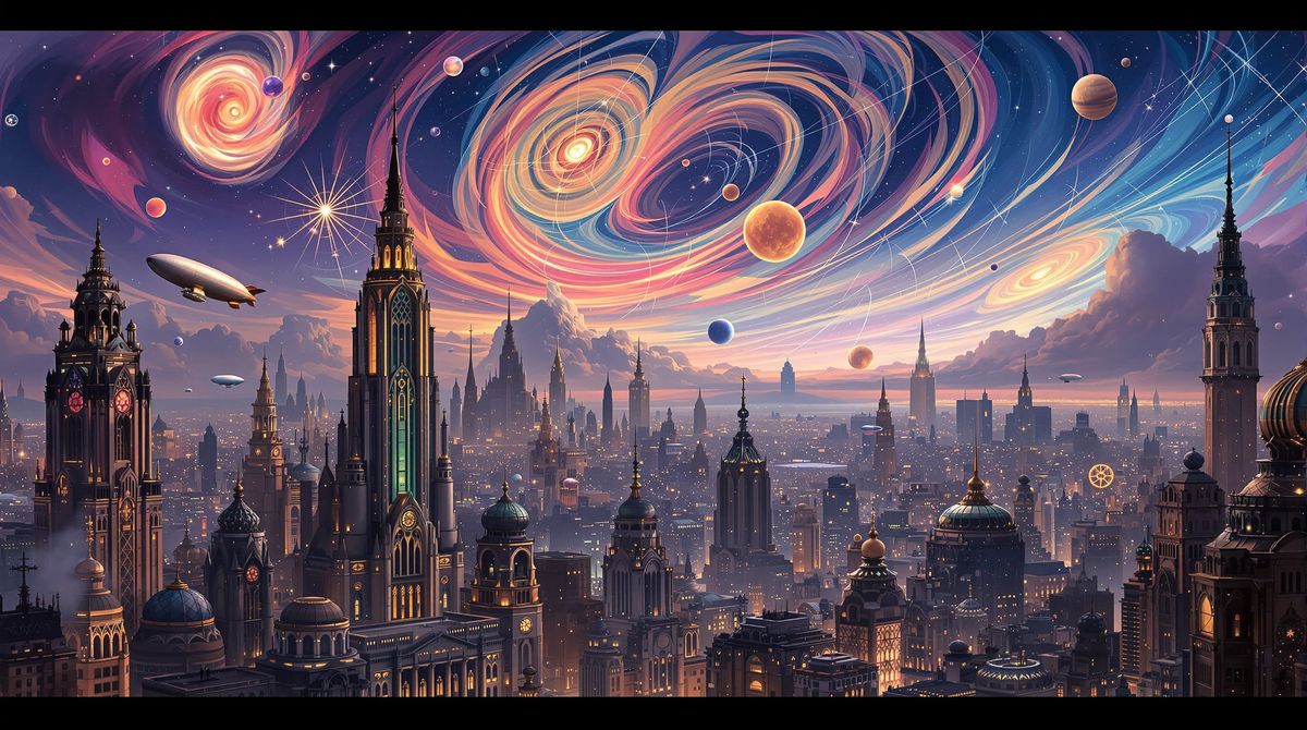A sprawling Art Deco cityscape at twilight, featuring zeppelins and vintage cars amidst ornate skyscrapers. The sky displays vibrant, geometric patterns, evoking wonder in a steampunk style.