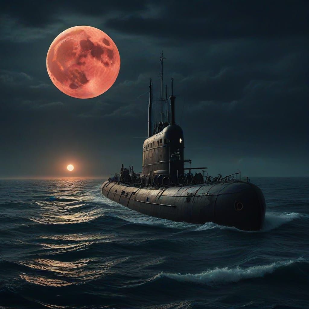 This eerie image depicts a vintage World War 2 submarine lurking in the mysterious Devil's Sea beneath a dramatic blood moon, creating a haunting and atmospheric scene.