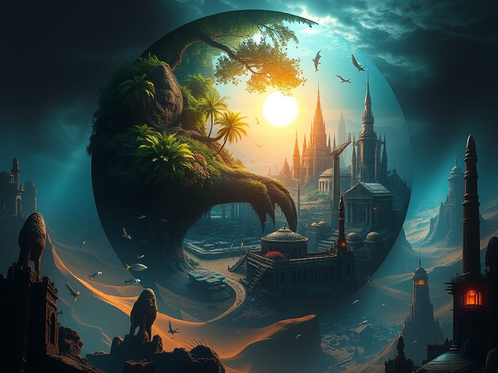 This image shows four layered fantasy cities: jungle, underwater, desert ruins, and futuristic. Rendered in a detailed, atmospheric, and cinematic concept art style.