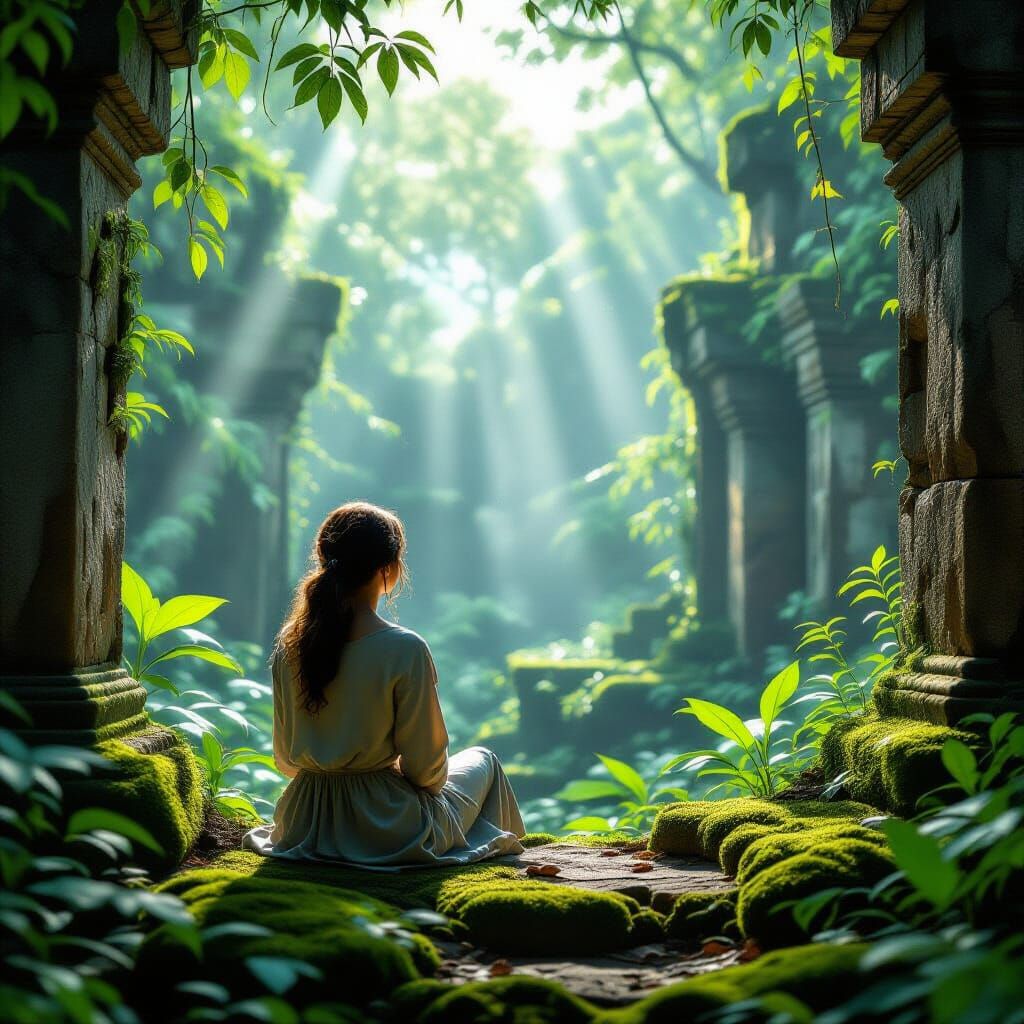 This hyperrealistic image shows a lone woman on mossy ruins, gazing at a jungle overgrowing ancient architecture. Cinematic lighting and HDR effects create a contemplative mood in a lost world.