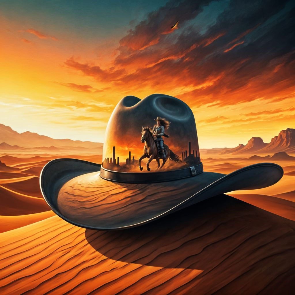 This oil painting depicts a surreal cowgirl hat with a miniature wild west desert scene at its base. Warm sunset hues and inkwash techniques create a magnificent, epic atmosphere.