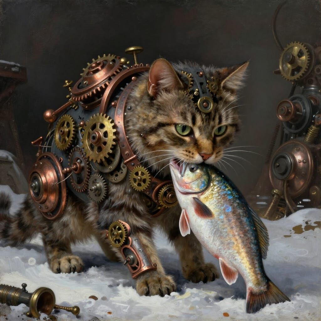 This image shows a hyper-realistic steampunk cat with integrated gears, biting a fish on snowy ground. Rendered in a dramatic, moody oil painting style with rich textures and deep shadows.
