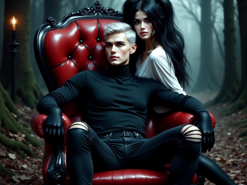 A photorealistic portrait of a young man with short white hair and athletic build, seated on a red throne in a dark misty forest, surrounded by a woman with sharp features and glowing threads controlling his movements, rendered in a baroque composition with surreal and gothic elements
