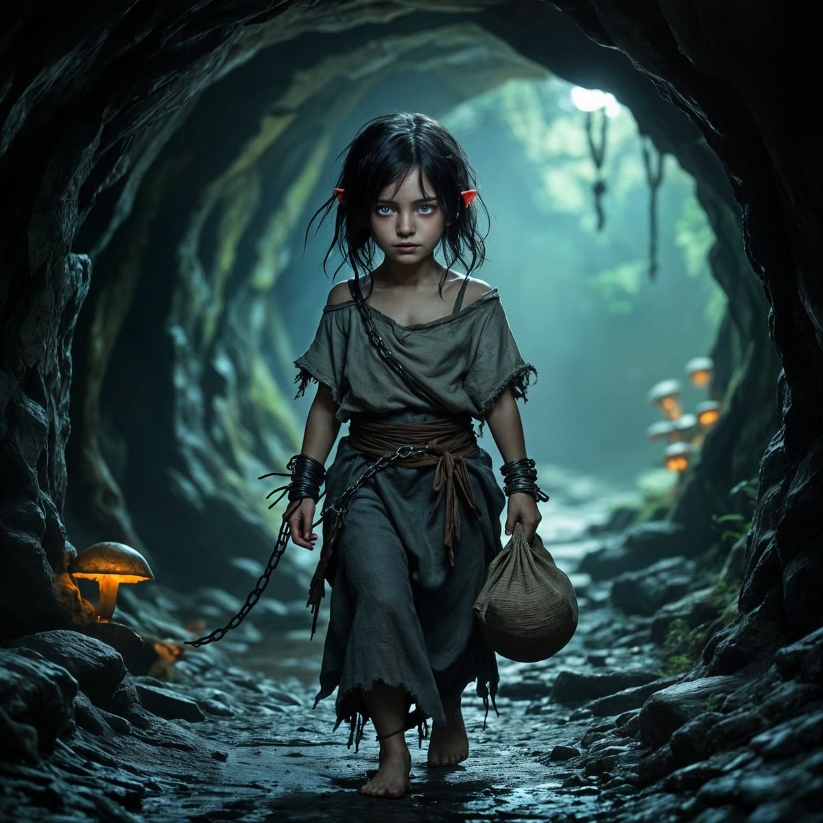 This image shows a young half-drow girl in worn clothing, walking barefoot in a dimly lit tunnel. Soft light from glowing fungi illuminates her gentle features and quiet determination.