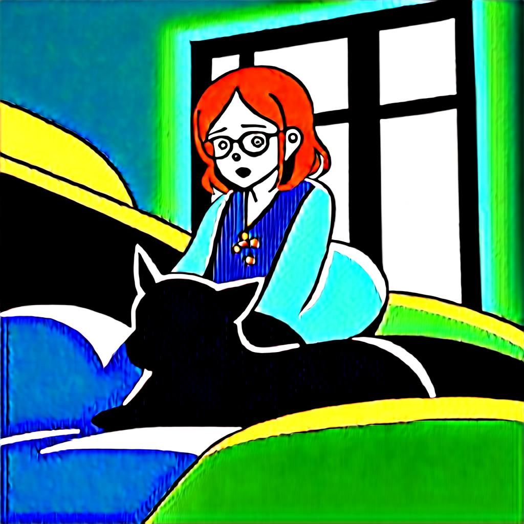 A digital image of a freckled girl with red and green hair in blue pajamas sitting on a bed. A black cat is beside her in a steampunk setting.
