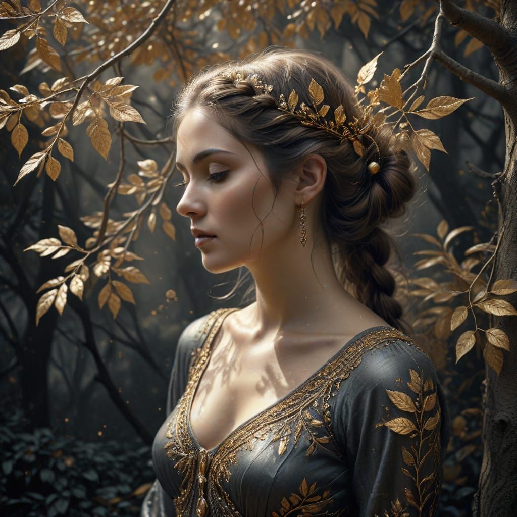 This detailed charcoal drawing shows a serene woman with a braided hairstyle creating a gilded tree. The illustrative style features monochromatic tones with selective gold accents and ethereal dust motes.