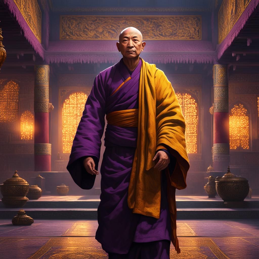 This image shows a bald Tibetan monk shrugging in a monastery. The artwork features dynamic lighting, intricate details, and deep colors reminiscent of dark fantasy concept art.