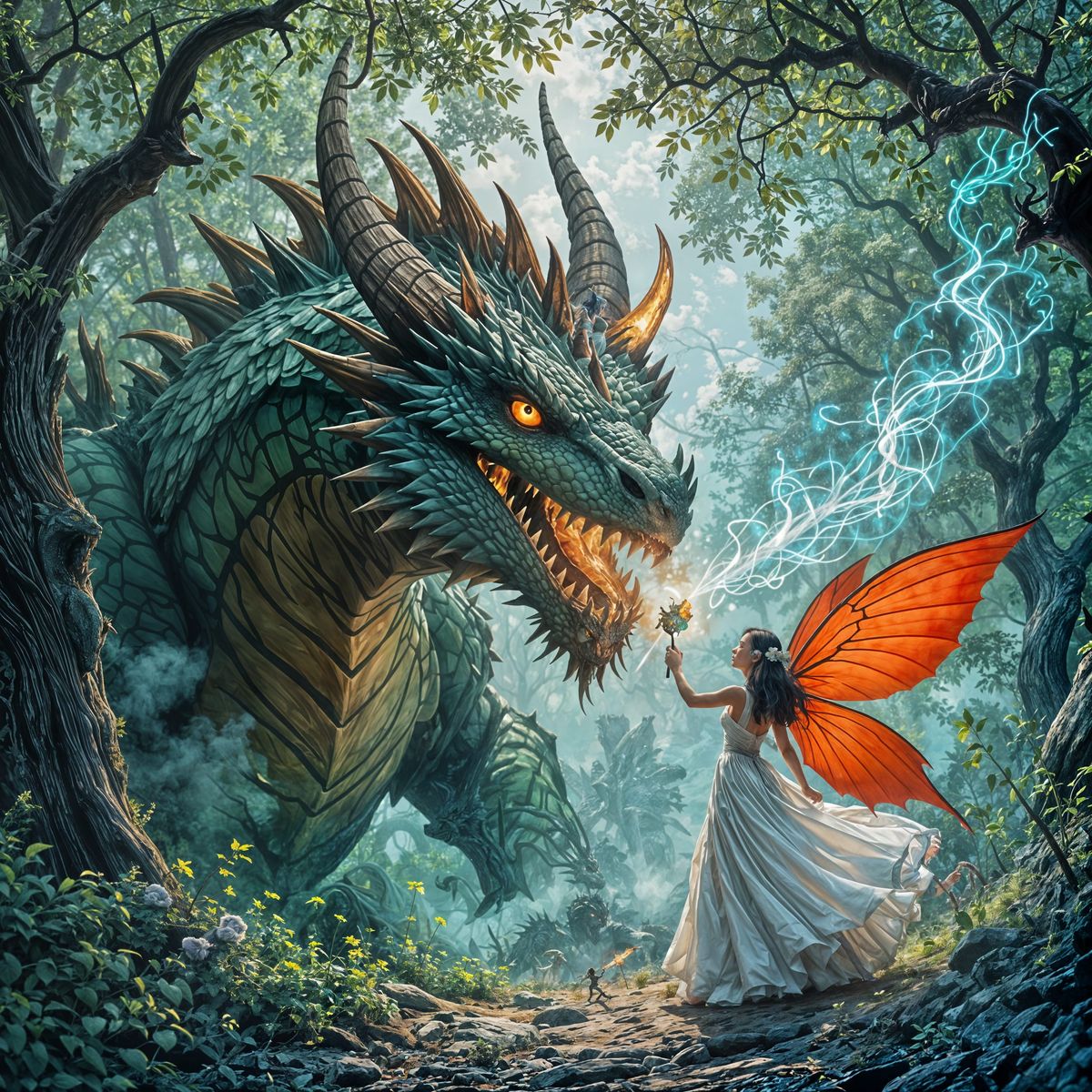 This image shows a fierce dragon with green scales and sharp horns battling a fairy in an oak forest. The dragon breathes fire as the fairy casts a protective spell.