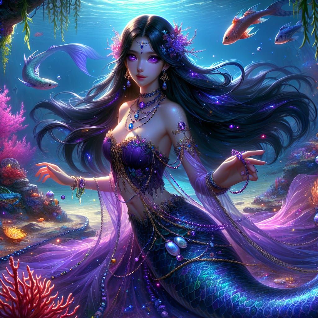 full body mermaid with scales on tail, dark skin, black flowing hair with purple hues, purple eyes with darker lines around iris, coral reef...