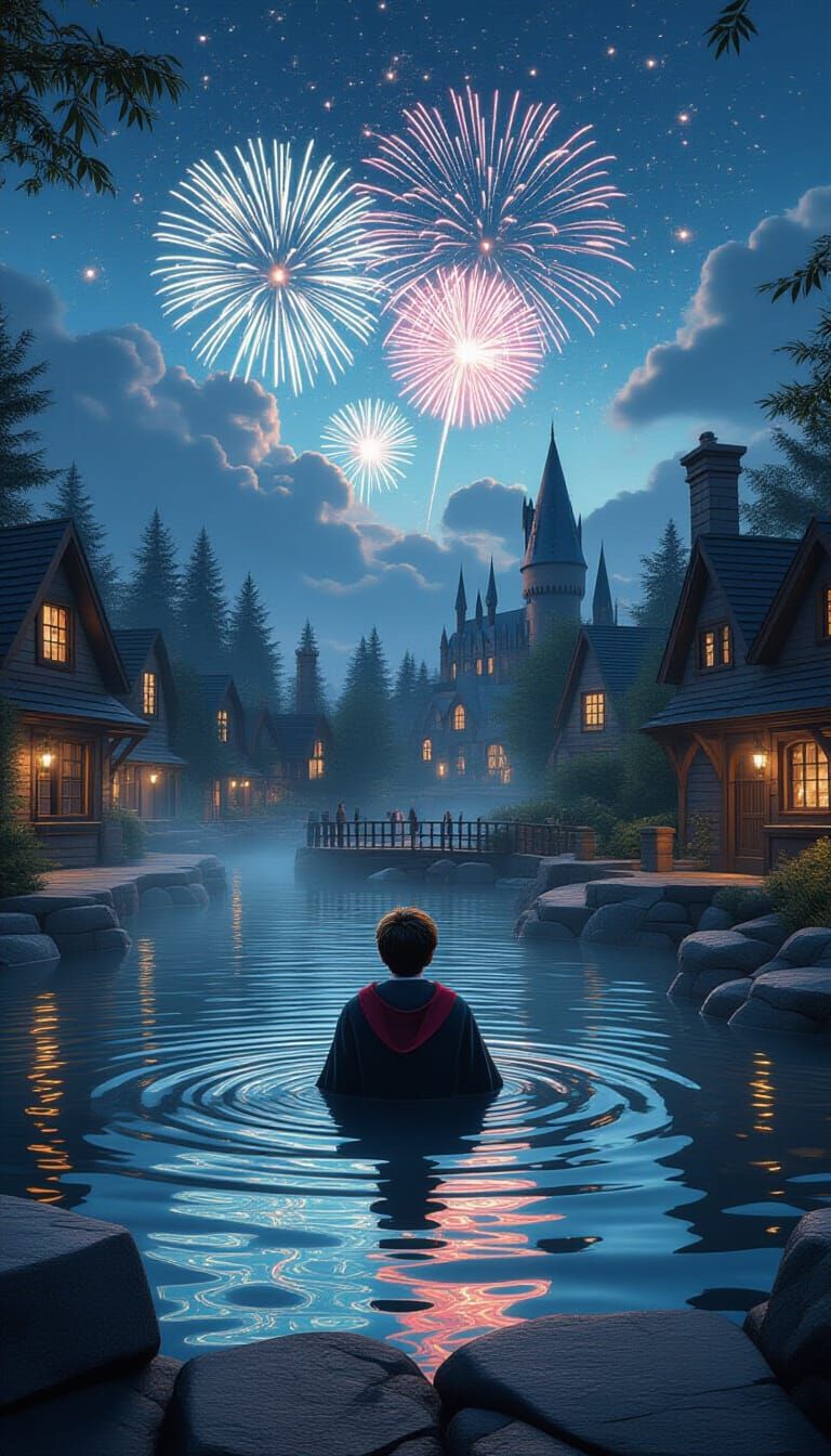 This image shows Harry Potter enjoying a peaceful hot springs surrounded by plants. Fireworks light the sky in the distance, rendered with dynamic lighting and cinematic qualities.