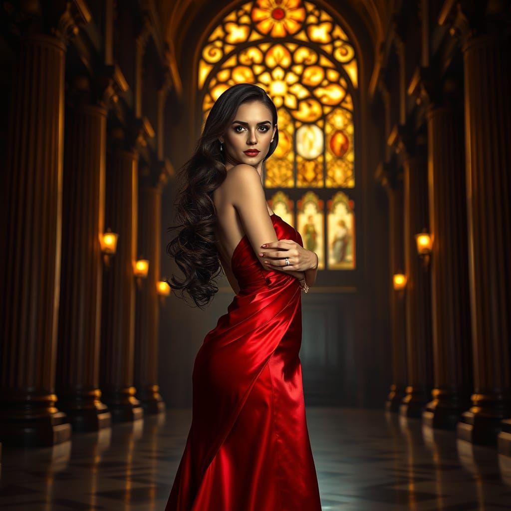 This image captures a stunning woman in a dramatic, red evening gown, posing in a dimly lit hall with ornate columns and a stained-glass window, exuding an air of sophistication and luxury, reminiscent of a gothic fairy tale with a touch of high-fashion drama.