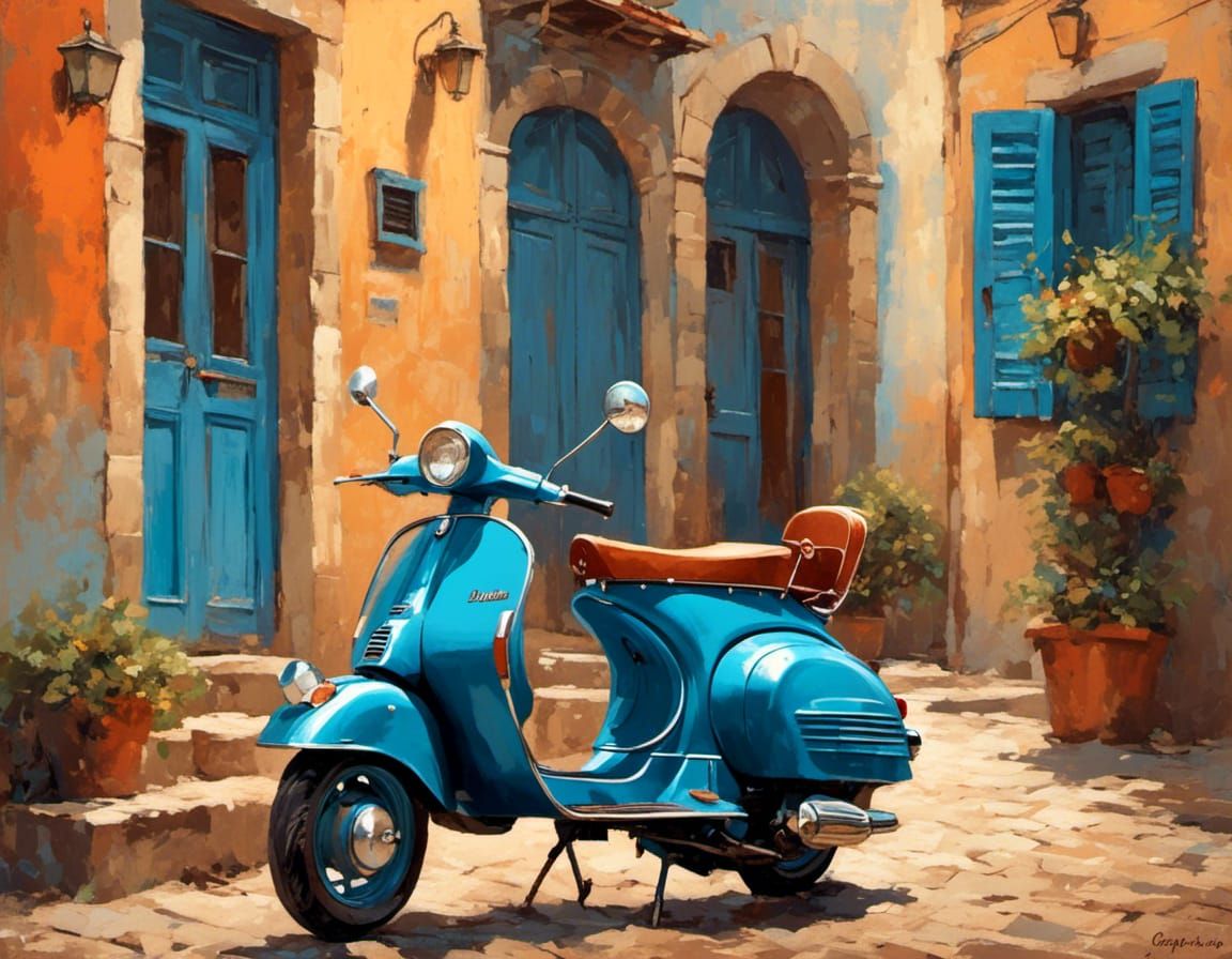 <lora:RetroRockabilly:1.0> Vintage Italian poster art style. Close up, a blue Piaggio Vespa on a cobblestone Italian street. Italian vintage art, old distressed textures,Soft warm sunlight reflecting off the Vespa's curved lines, casting long shadows. Golden hour lighting with a warm glow, gradient ...