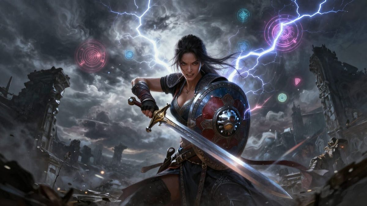 This digital matte painting depicts a powerful female warrior confronting a violent spectral storm. She braces for combat amidst ancient ruins, with arcane symbols in the air, emphasizing strength and dramatic atmosphere.