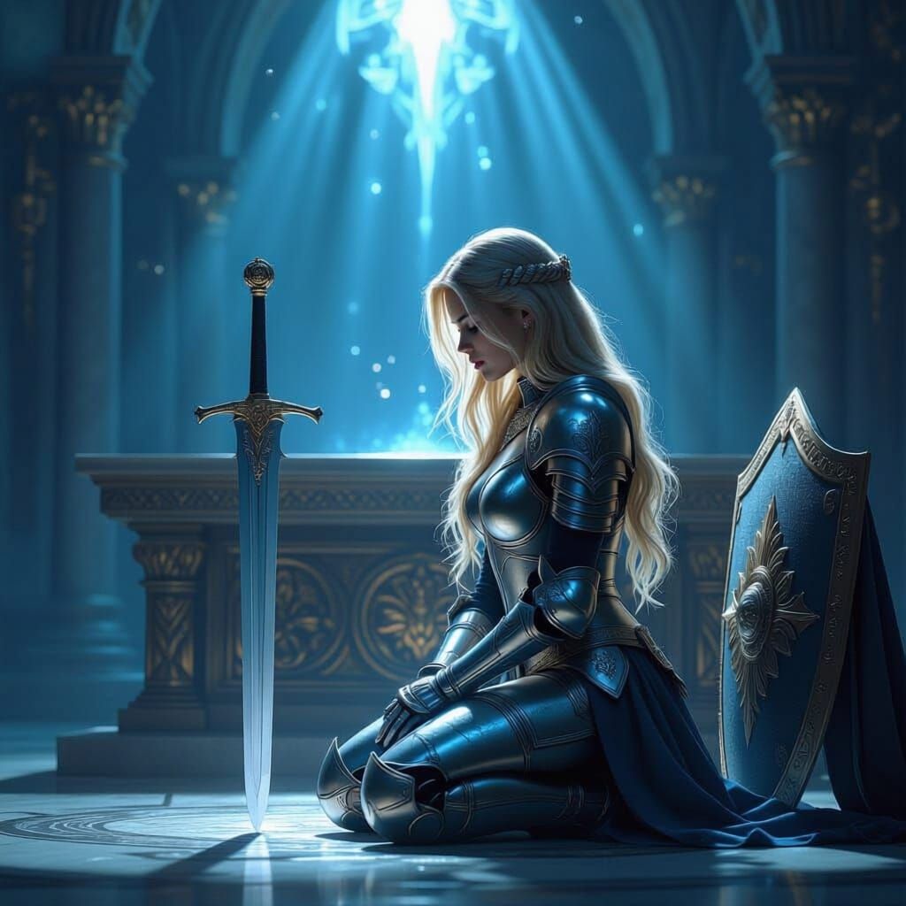 This image depicts a courageous knight in silvery armor, kneeling in prayer before a stone altar. A radiant sword and shield are nearby, illuminated by ethereal celestial light in an epic fantasy concept art style.