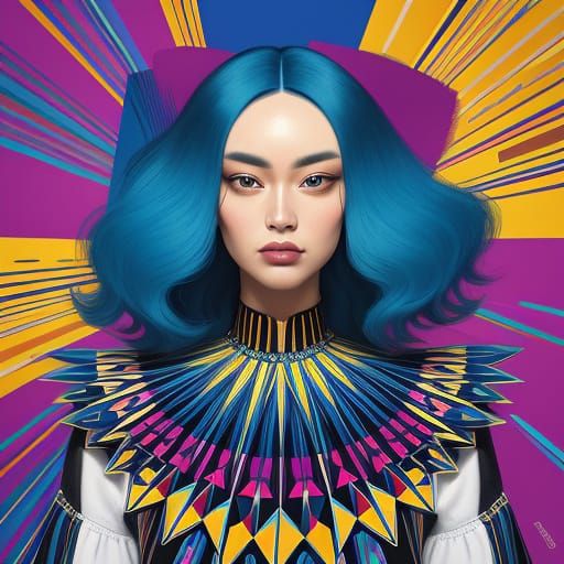 A symmetrical screen print featuring a woman with blue hair and dogs in jeweled collars against a Bauhaus geometric background. Rendered in triadic colors with splash screen art elements.