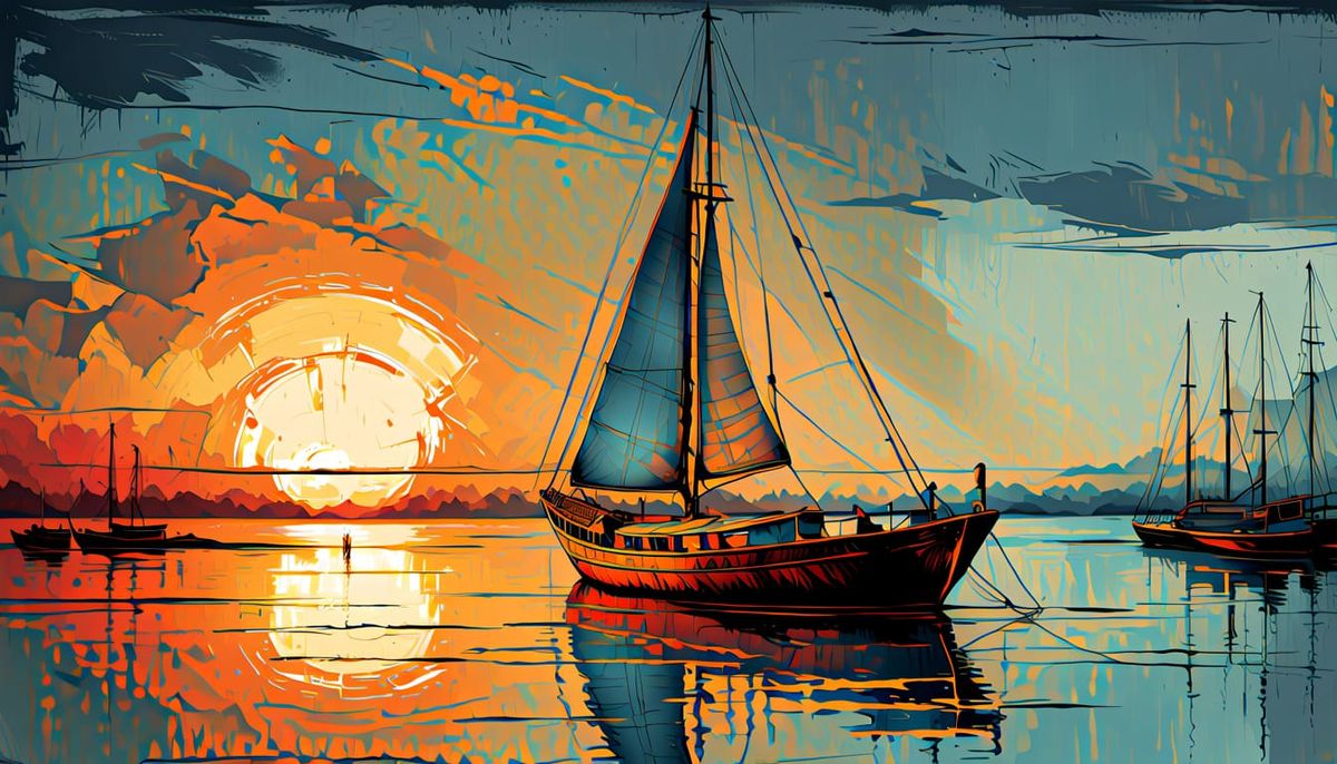 This serene image captures a sailboat resting on a still lake in the warm golden light of sunset, with a blend of expressive brushstrokes, dreamy colors, and dramatic light, evoking a nostalgic atmosphere with triadic blues, yellows, and reds.