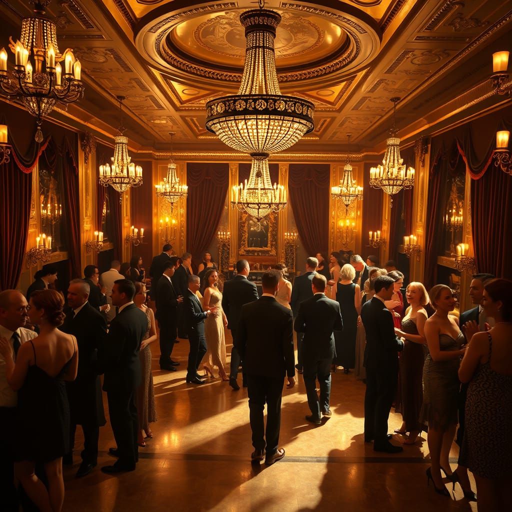 This image depicts a lavish 1920s golden hall filled with elegantly dressed people, inspired by Art Deco opulence with rich textures and dramatic lighting.