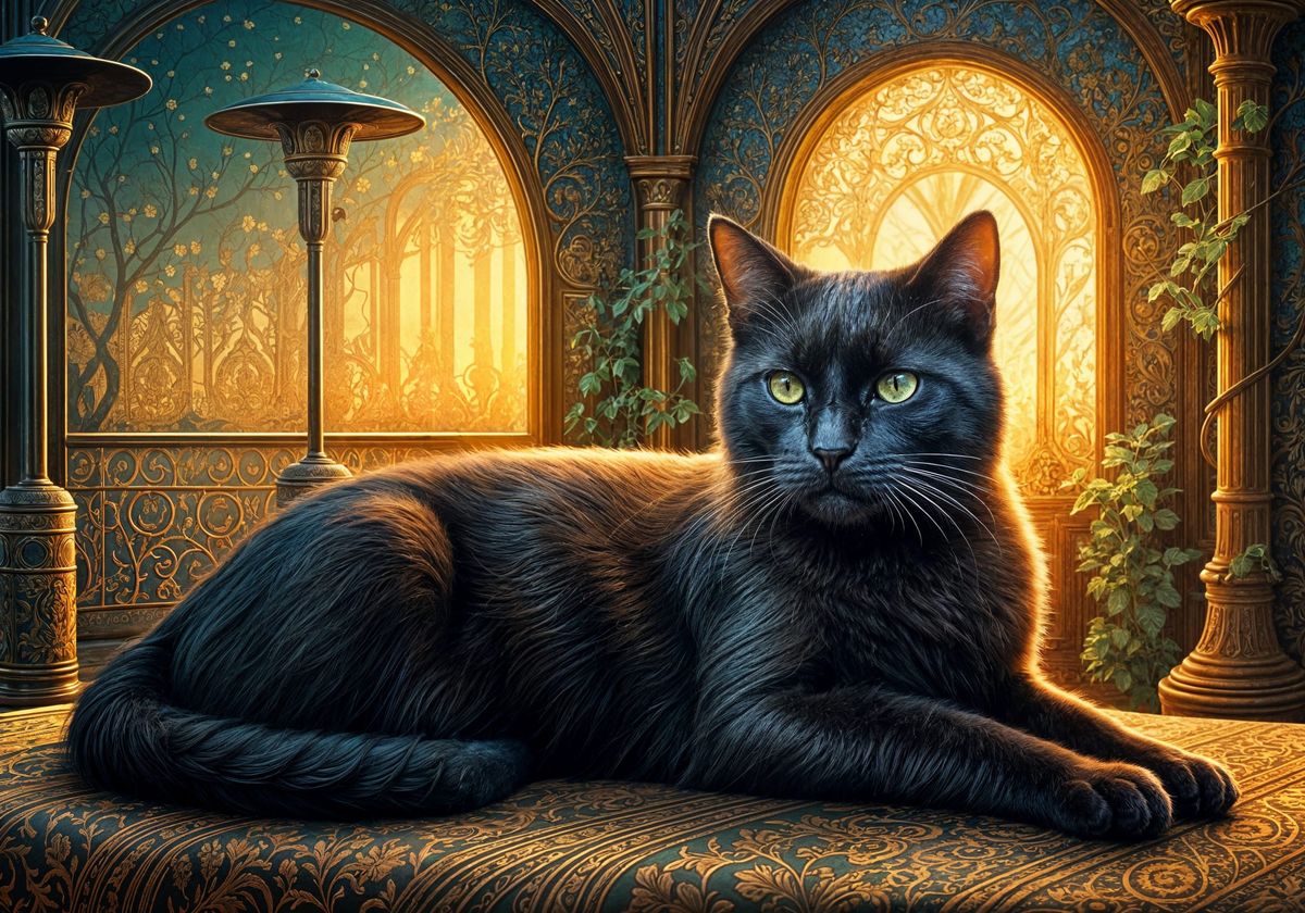 This image shows a majestic black cat in a lavish Art Nouveau-inspired setting, with intricate golden-brocade textures and ornate veranda details. The cat's luxurious fur and piercing eyes exude regal intensity, set against a backdrop of swirling turquoise and gold patterns.