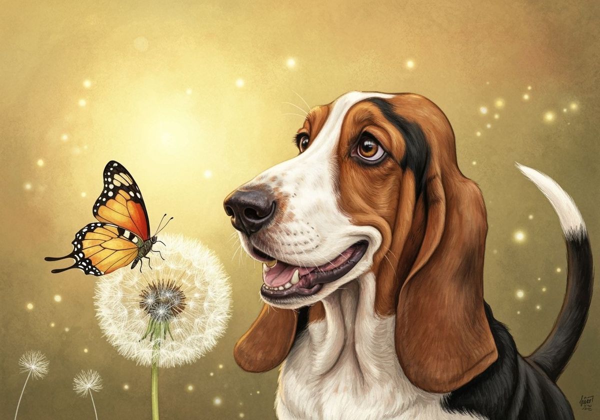 A close-up portrait of a smiling Basset Hound with detailed fur, observing a butterfly on a dandelion. Rendered in a fairytale style with soft watercolor washes and warm golden hour light.