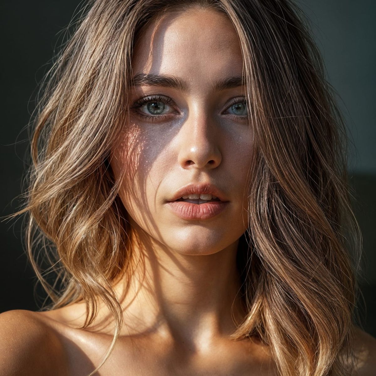 This image captures a striking woman with soft, flowing hair and a radiant glow, blending natural and sun-kissed tones in a hyper-detailed digital painting style reminiscent of cinematic lighting and retro-futuristic atmospheres.