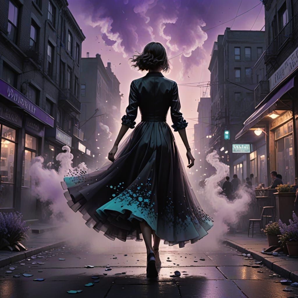 A grayscale cityscape at twilight features a turquoise mist rising from a cracked sidewalk. The mist forms a woman's silhouette, her dress of smoke and lavender, in a mystical urban noir style.