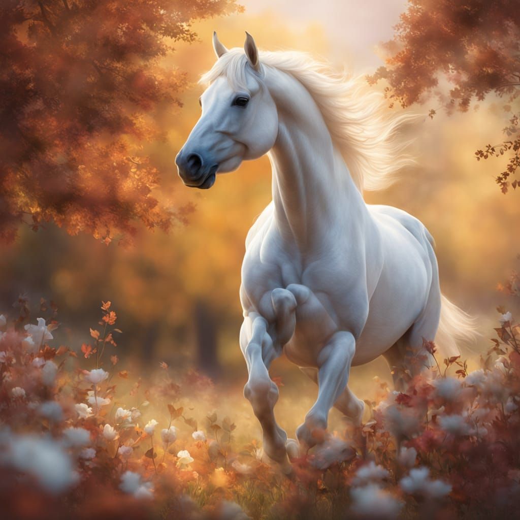 This image captures a majestic white horse galloping through a vibrant autumn landscape, bathed in the warm, golden light of a cinematic film grain aesthetic with soft focus and textured brushstrokes, reminiscent of Impressionist and Realist art styles.