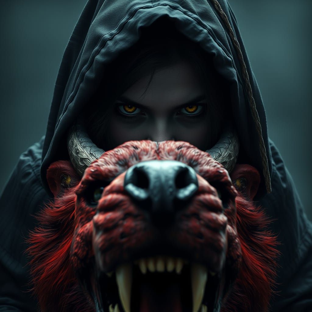 A sinister, close-up horror portrait of an angry girl with fangs and a red hellhound. The digital art features expressive yellow eyes, darkness, and a grainy, detailed style.