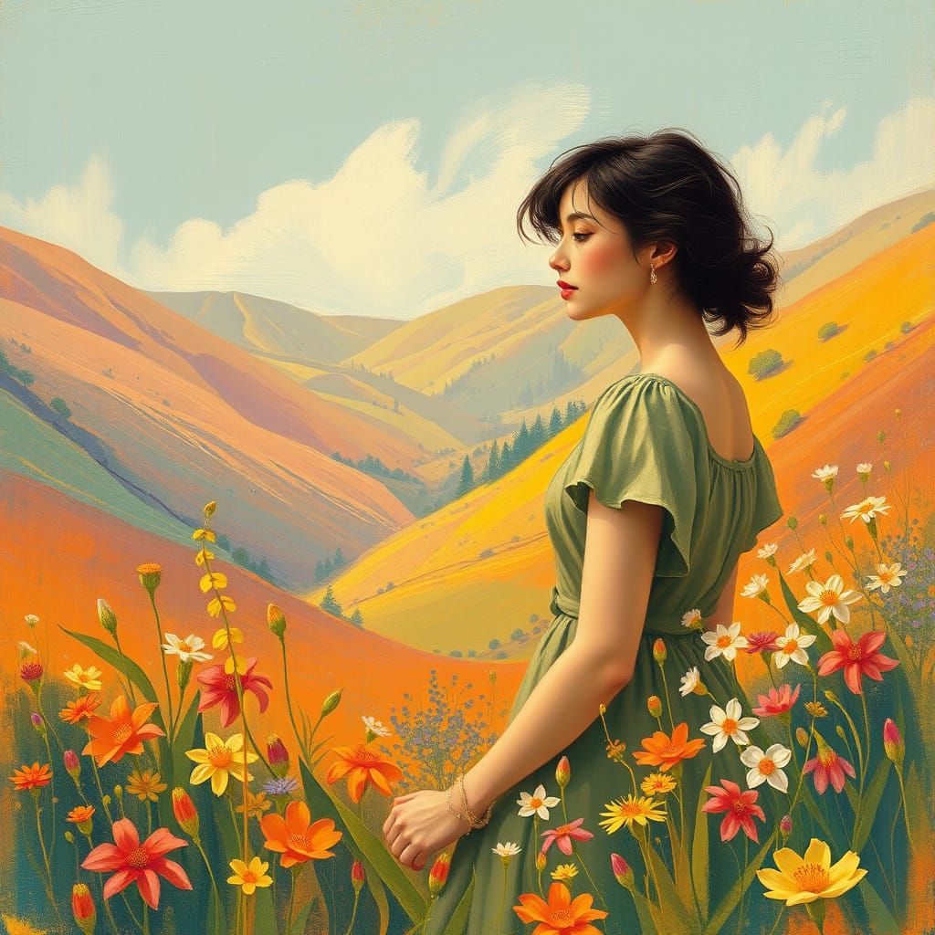 This image shows a serene woman in a vibrant valley filled with flowers. The style evokes impressionist paintings with soft brushstrokes and warm lighting.