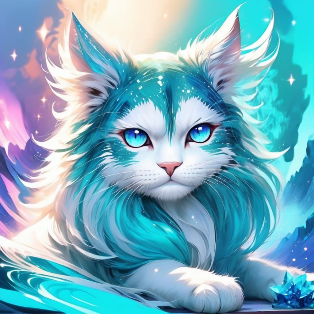 This image shows a beautiful anime cat with long, two-toned turquoise hair and shimmering eyes. The cat's sweet face sparkles, creating an elegant and magical effect.