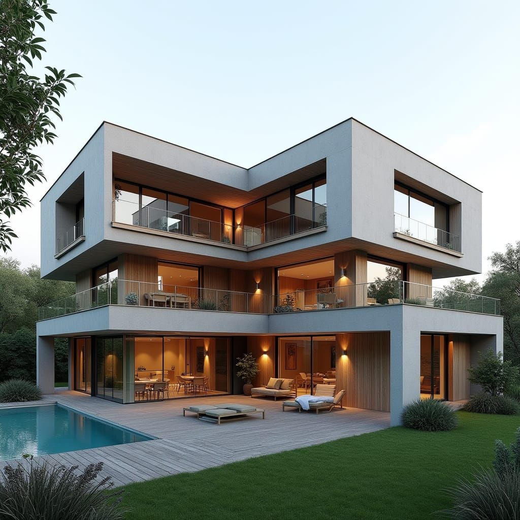 This image shows a modern urban villa constructed from concrete and solid wood, featuring two stories, large panoramic windows, terraces, a conservatory, a garden with a pool, and fruit trees.