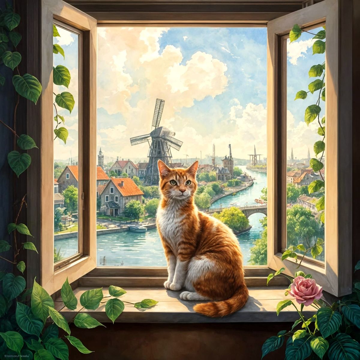 This image is a charming depiction of a feline in a traditional Dutch watercolor style, with soft brushstrokes and muted colors.