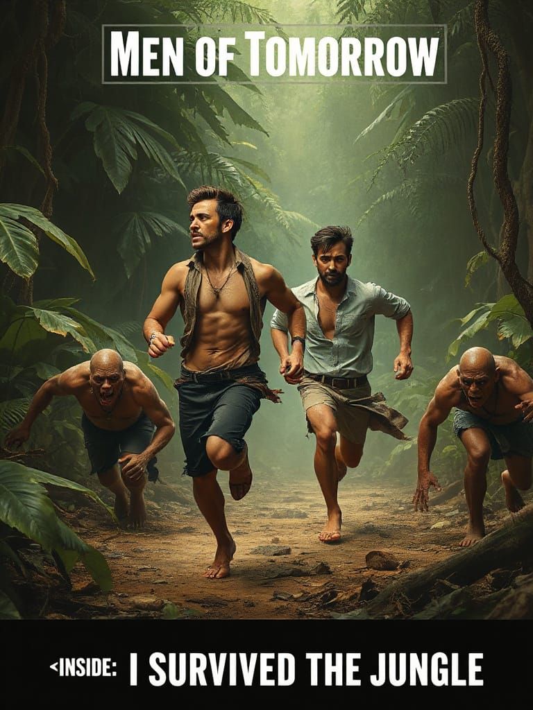 A high-contrast image shows two men fleeing through a jungle, chased by cannibals. The scene is reminiscent of 1950s pulp magazine covers in a dark, futuristic aesthetic.