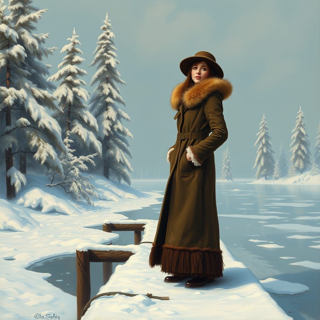 This image depicts a serene winter scene, a woman standing on a frozen pier, surrounded by snow-covered trees, bathed in soft, serene light, reminiscent of 19th-century Russian landscape art